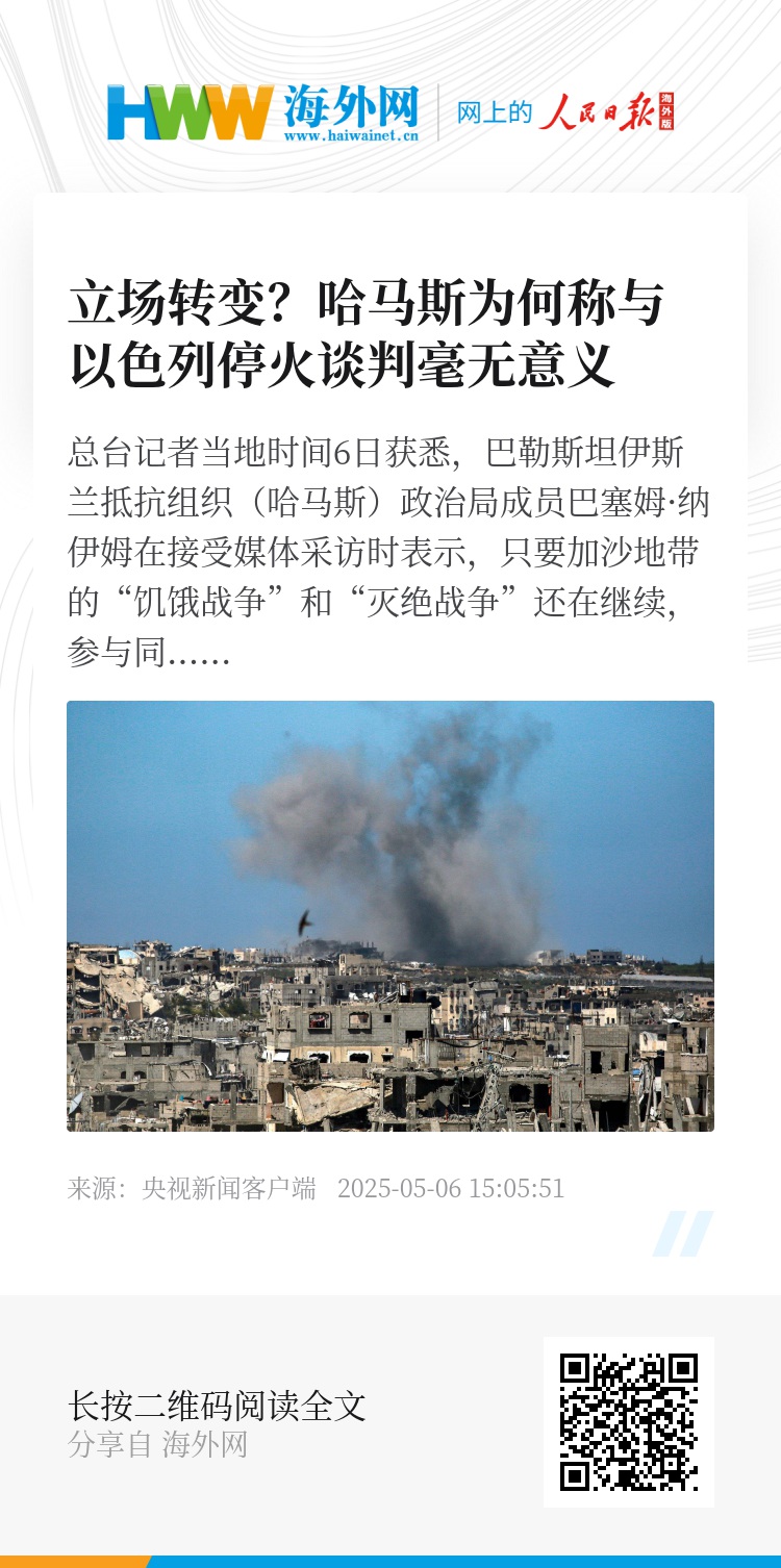 总台记者当地时间6日获悉,巴勒斯坦伊斯兰抵抗组织(哈马斯)政治局成员巴塞姆·纳伊姆在接受媒体采访时表示,只要加沙地带的“饥饿战争”和“灭绝战争”还在继续,参与同以色列谈判或考虑新的停火协议毫无意义。