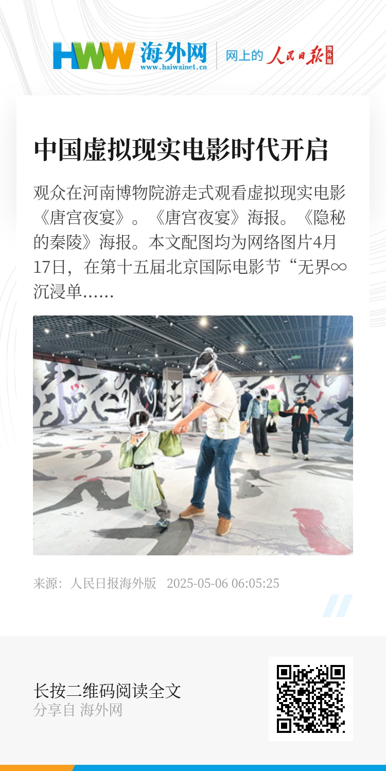 “传统文化和虚拟技术结合的模式能够活化历史场景,推动文旅融合。未来将会有更多历史、非遗等题材进入该领域,成为文化传播的创新载体。”苏翼飞介绍,《唐宫夜宴》已经在北京、成都、郑州、杭州和河南永城等地开展项目运营,并作为中国首部出海的虚拟现实电影,两次受邀赴俄罗斯进行文化交流。《隐秘的秦陵》也应马来西亚有关单位的邀请,4月中旬在吉隆坡展映。她表示,今年下半年还将带着作品参加法国戛纳电影节的推介展映活动。(徐昳清 苗 春)