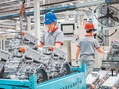 安徽省芜湖市通过优化营商环境、强化科技攻关等措施,积极推进新能源汽车产业发展。图为在芜湖市繁昌经济开发区,工人在芜湖埃科动力智能生产线上组装生产DHT混动变速箱。