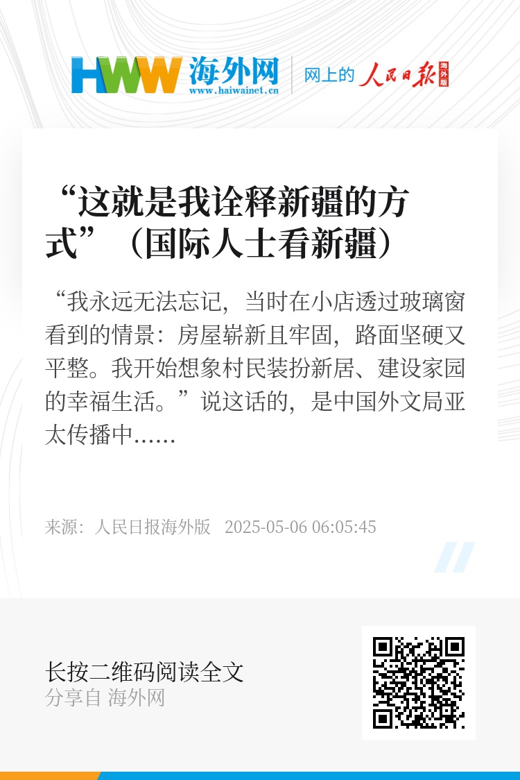 拉斐尔注意到,一些西方媒体惯于杜撰“种族灭绝”“强迫劳动”等谎言。“这跟我看到的新疆完全相反!我会继续写文章、拍视频,讲述我在新疆看到的一切,驳斥一些西方媒体的谎言。”