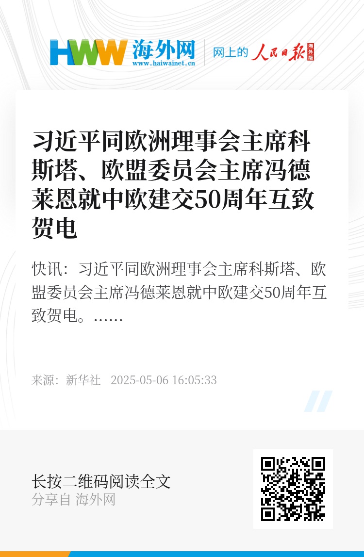 新华社快讯:习近平同欧洲理事会主席科斯塔、欧盟委员会主席冯德莱恩就中欧建交50周年互致贺电。