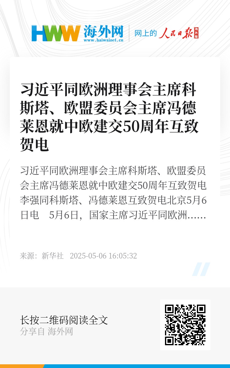新华社北京5月6日电 5月6日,国家主席习近平同欧洲理事会主席科斯塔、欧盟委员会主席冯德莱恩互致贺电,热烈庆祝中国和欧盟建交50周年。