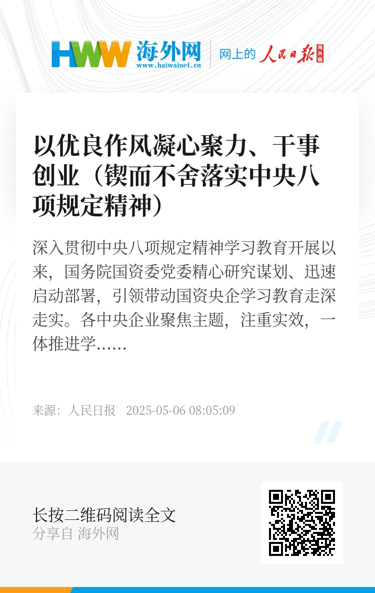 深入贯彻中央八项规定精神学习教育开展以来,国务院国资委党委精心研究谋划、迅速启动部署,引领带动国资央企学习教育走深走实。各中央企业聚焦主题,注重实效,一体推进学查改,以优良作风凝心聚力、干事创业。