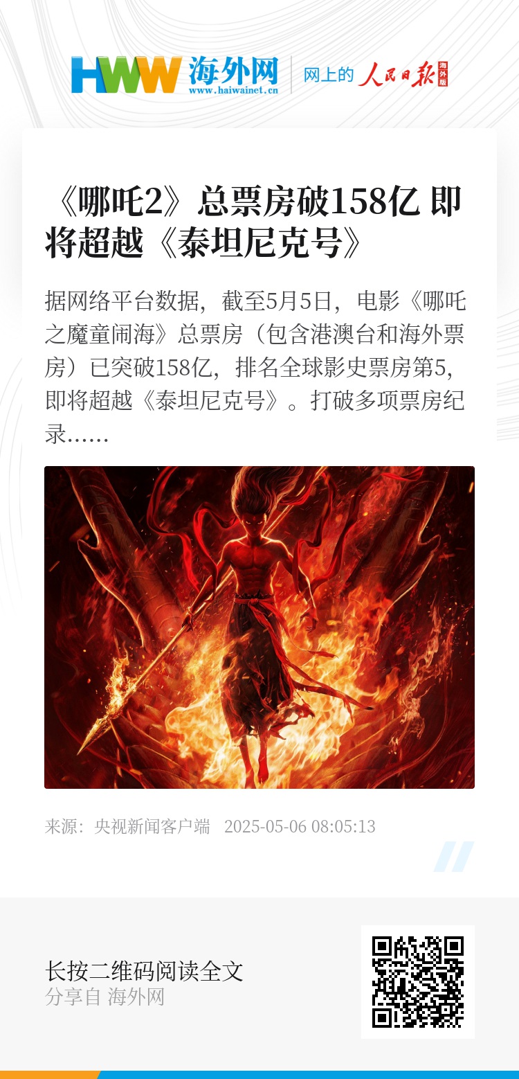 据网络平台数据,截至5月5日,电影《哪吒之魔童闹海》总票房(包含港澳台和海外票房)已突破158亿,排名全球影史票房第5,即将超越《泰坦尼克号》。