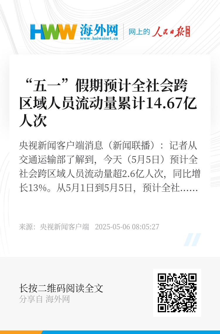 央视新闻客户端消息(新闻联播):记者从交通运输部了解到,今天(5月5日)预计全社会跨区域人员流动量超2.6亿人次,同比增长13%。从5月1日到5月5日,预计全社会跨区域人员流动量累计14.67亿人次。