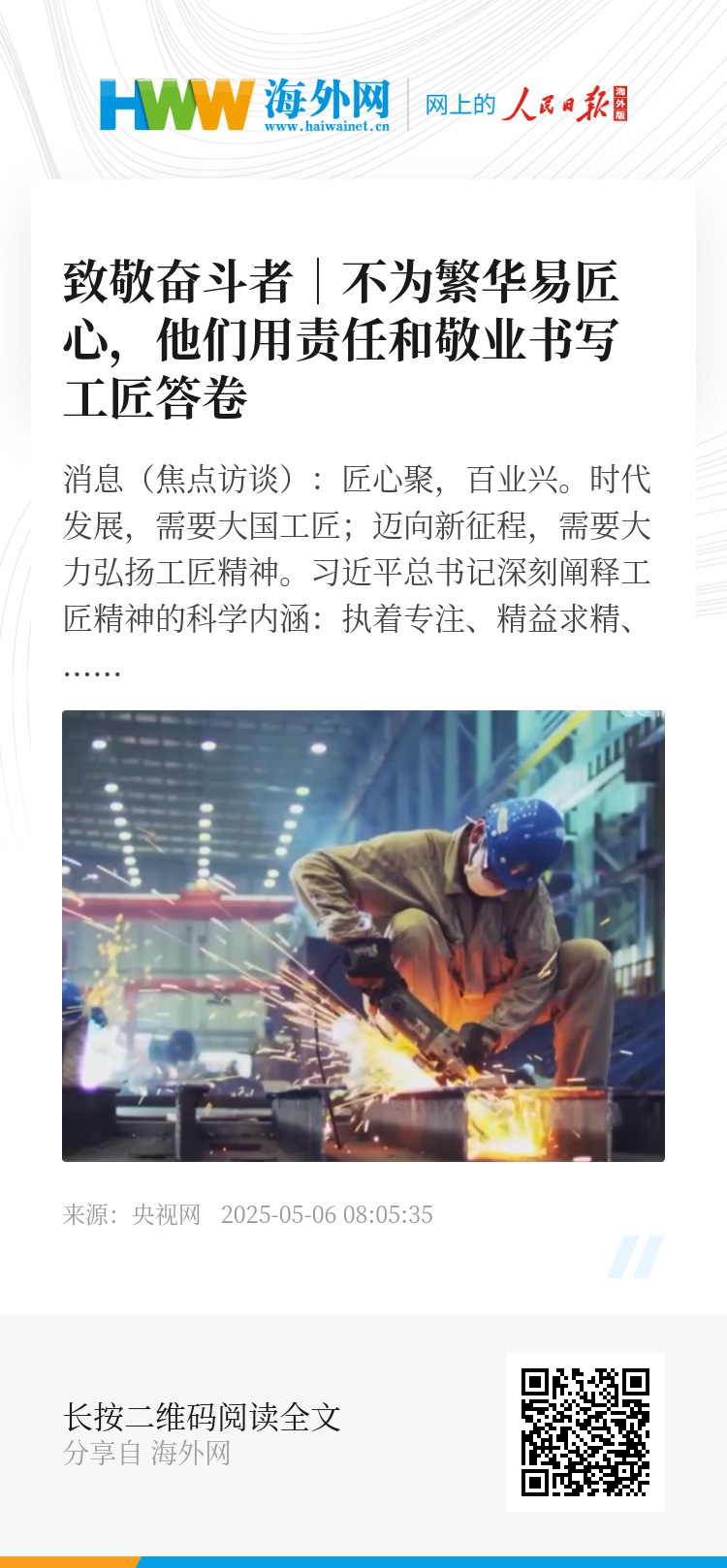 央视网消息(焦点访谈):匠心聚,百业兴。时代发展,需要大国工匠;迈向新征程,需要大力弘扬工匠精神。习近平总书记深刻阐释工匠精神的科学内涵:执着专注、精益求精、一丝不苟、追求卓越;强调“要在全社会弘扬精益求精的工匠精神”“培养更多高素质技术技能人才、能工巧匠、大国工匠”。5月5日的节目,我们就来看看几位劳动者用睿智敬业展现出的工匠精神。