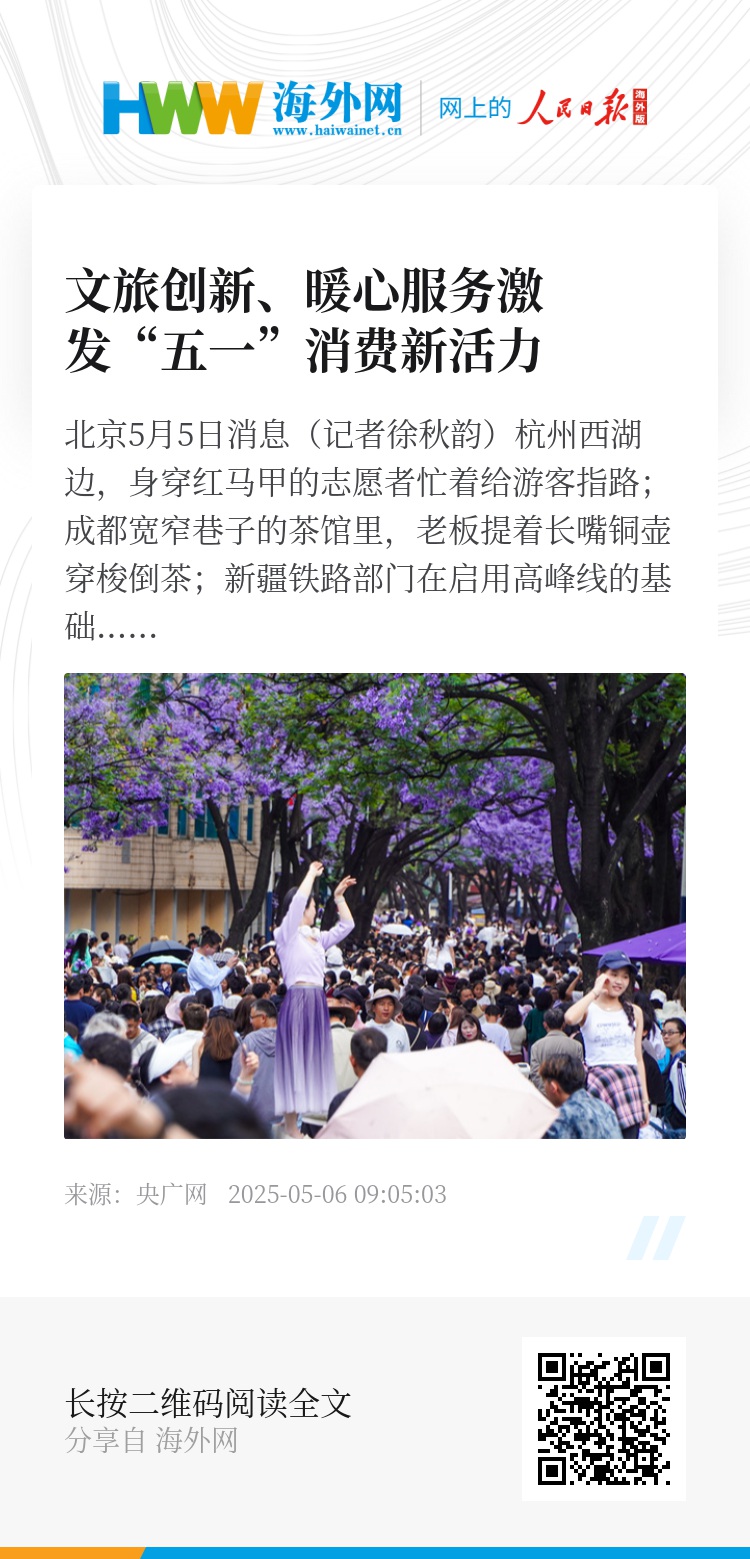 央广网北京5月5日消息(记者徐秋韵)杭州西湖边,身穿红马甲的志愿者忙着给游客指路;成都宽窄巷子的茶馆里,老板提着长嘴铜壶穿梭倒茶;新疆铁路部门在启用高峰线的基础上,增开了近450列旅客列车;郑州东站平均2分钟驶出一趟高铁;济南天下第一泉风景区趵突泉园延长开放时间……这个“五一”假期,人潮涌向天南海北。