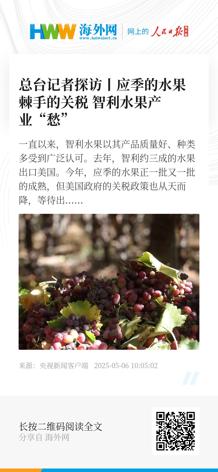 一直以来,智利水果以其产品质量好、种类多受到广泛认可。去年,智利约三成的水果出口美国。今年,应季的水果正一批又一批的成熟,但美国政府的关税政策也从天而降,等待出口的应季水果和棘手的关税令智利的水果产业怎一个愁字了得。总台记者近日来到智利的水果产区,来看看那里的农场主、水果产业从业者怎么说。