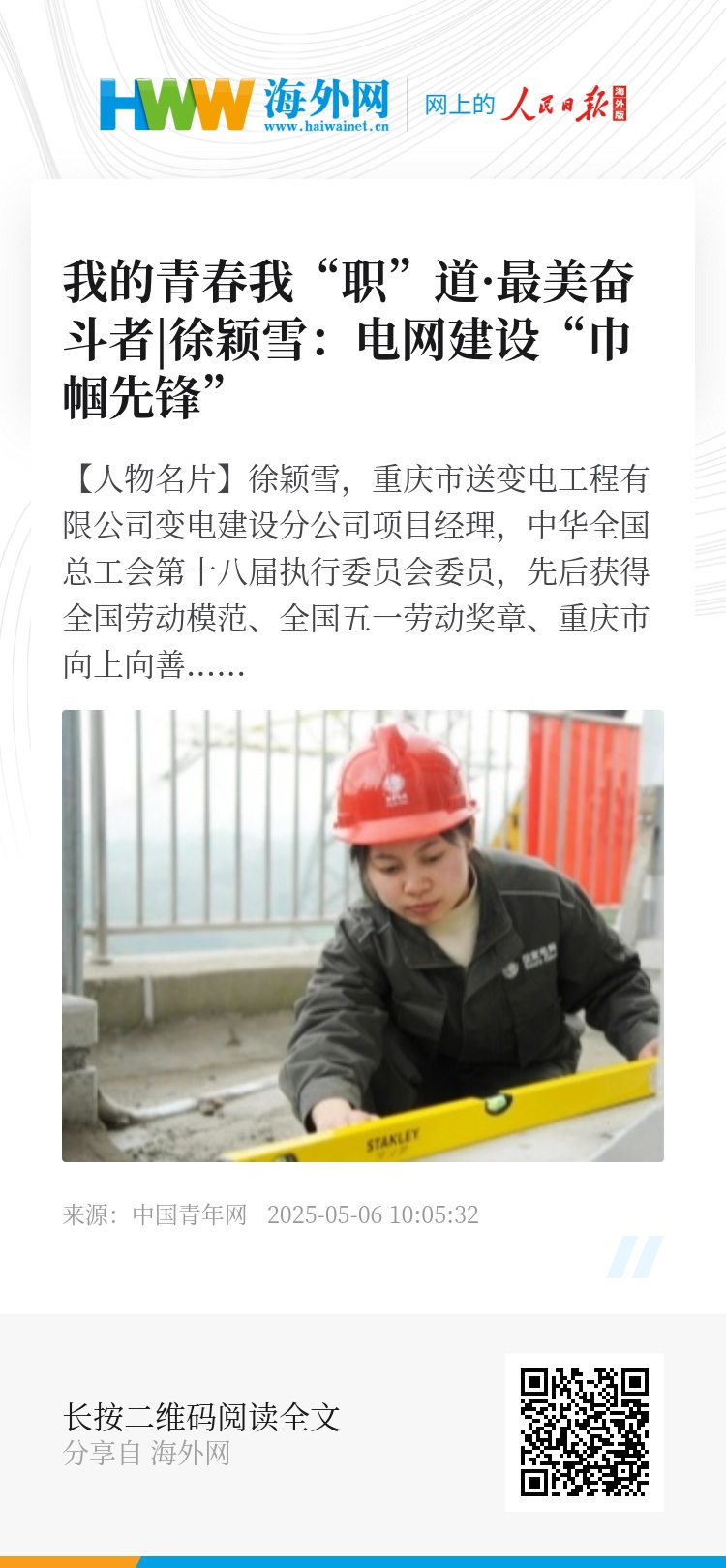 【人物名片】徐颖雪,重庆市送变电工程有限公司变电建设分公司项目经理,中华全国总工会第十八届执行委员会委员,先后获得全国劳动模范、全国五一劳动奖章、重庆市向上向善好青年、重庆市最美产业工人、重庆五一劳动奖章、国家电网有限公司特等劳动模范等荣誉。