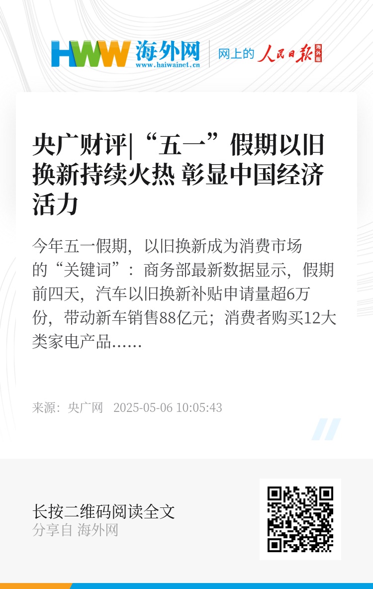 今年五一假期,以旧换新成为消费市场的“关键词”:商务部最新数据显示,假期前四天,汽车以旧换新补贴申请量超6万份,带动新车销售88亿元;消费者购买12大类家电产品356万台,带动销售119亿元;购买手机等数码产品242万件,带动销售64亿元。