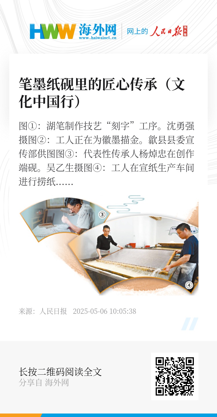 湖笔制作技艺、徽墨制作技艺、宣纸制作技艺、端砚制作技艺,均为第一批国家级非物质文化遗产名录中的代表性项目。人民日报记者分别走进湖笔、徽墨、宣纸、端砚的故乡,透过代代相传的匠心,感受传统技艺在今天何以赓续绵延,生生不息。