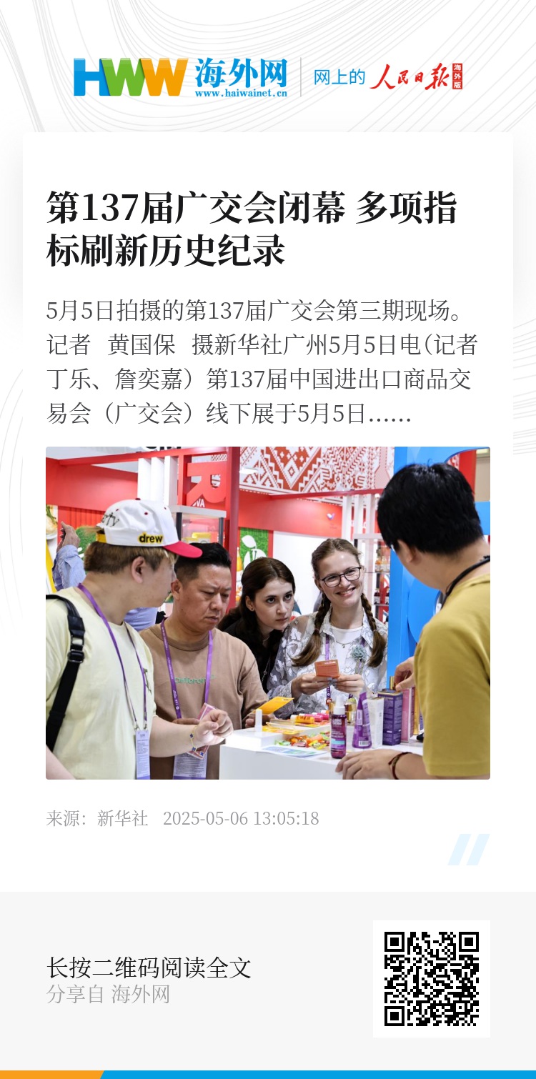 新华社广州5月5日电(记者丁乐、詹奕嘉)第137届中国进出口商品交易会(广交会)线下展于5月5日在广州闭幕,到会境外采购商人数和现场意向出口成交等多项指标刷新历史纪录。截至5月4日,共有来自219个国家和地区的28.89万名境外采购商到会,较去年春季同期举行的第135届广交会同比增长17.3%;现场意向出口成交254.4亿美元,同比增长3%。