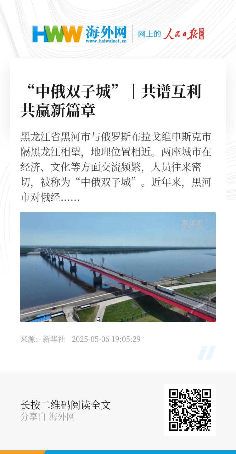 黑龙江省黑河市与俄罗斯布拉戈维申斯克市隔黑龙江相望,地理位置相近。两座城市在经济、文化等方面交流频繁,人员往来密切,被称为“中俄双子城”。