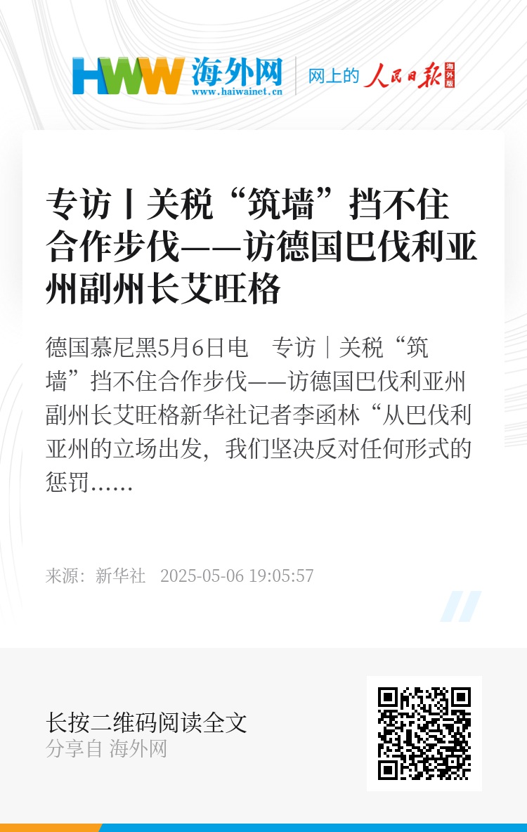 新华社德国慕尼黑5月6日电 专访|关税“筑墙”挡不住合作步伐——访德国巴伐利亚州副州长艾旺格