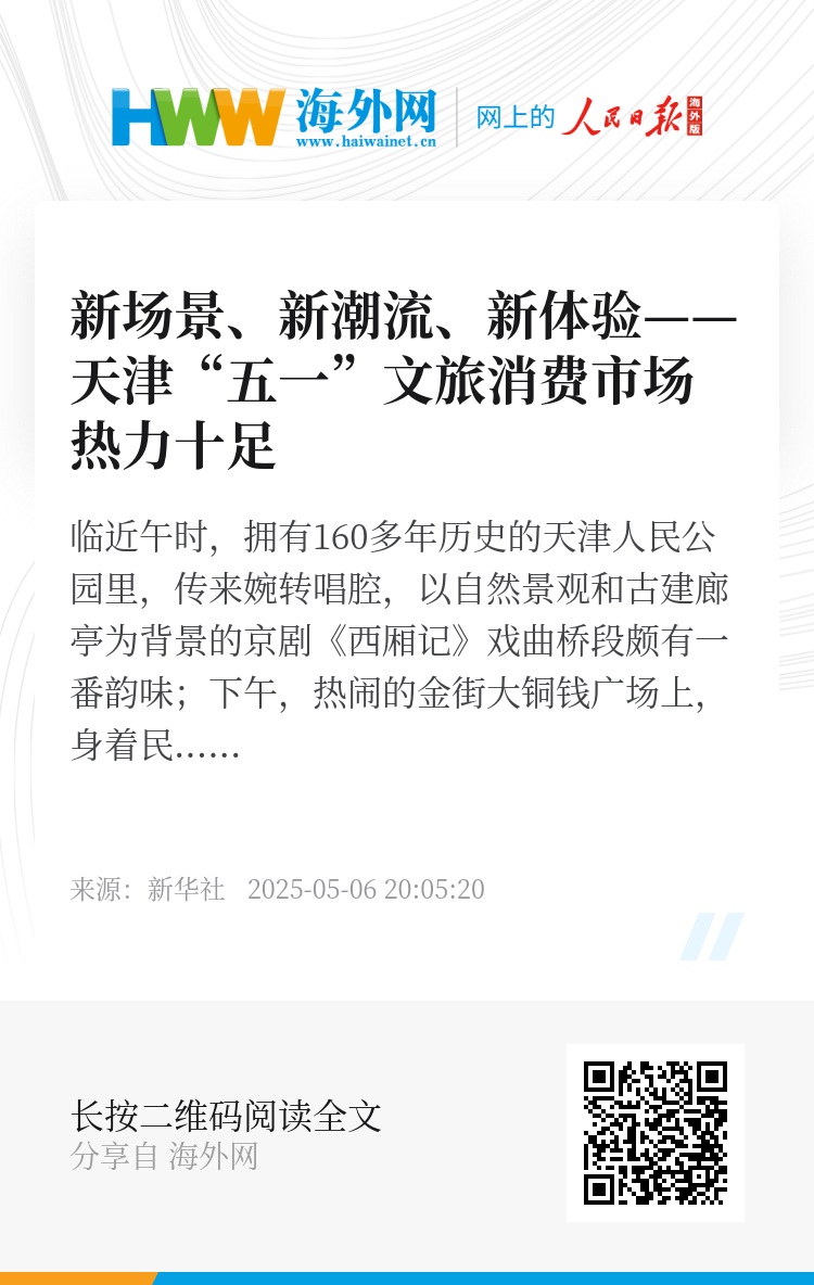“五一”期间,天津打造了300多项文旅活动,接待游客近1700万人次,同比增长20.3%;游客花费近150亿元,同比增长22.5%,激活了假日文旅市场活力。