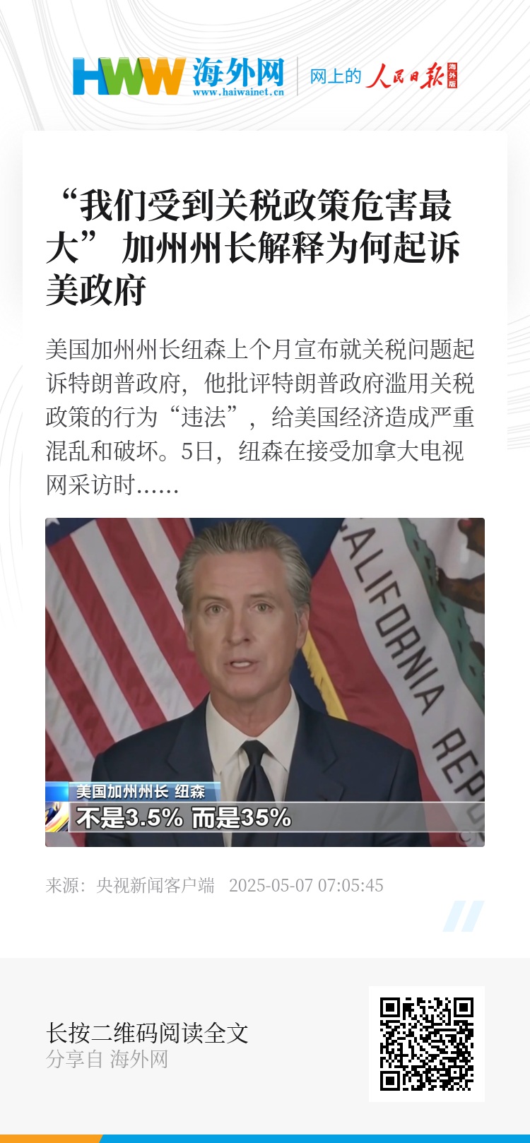 纽森称,加州作为全美经济最强州,受到关税政策的危害也最大。