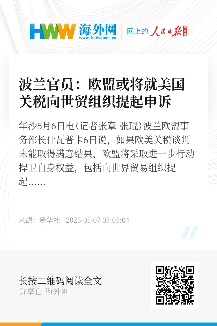 新华社华沙5月6日电(记者张章 张琨)波兰欧盟事务部长什瓦普卡6日说,如果欧美关税谈判未能取得满意结果,欧盟将采取进一步行动捍卫自身权益,包括向世界贸易组织提起申诉。