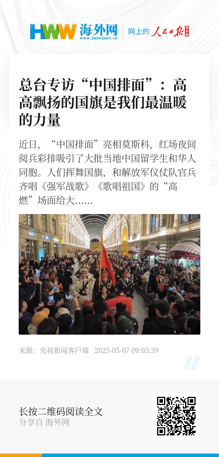 应俄罗斯国防部邀请,5月9日,中国人民解放军仪仗司礼大队仪仗分队119名官兵将在莫斯科参加纪念苏联伟大卫国战争胜利80周年阅兵活动。期待“中国排面”闪耀海外,震撼出场!