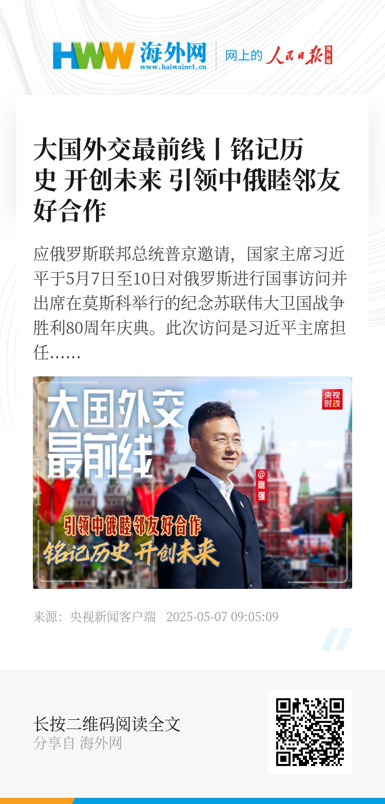 应俄罗斯联邦总统普京邀请,国家主席习近平于5月7日至10日对俄罗斯进行国事访问并出席在莫斯科举行的纪念苏联伟大卫国战争胜利80周年庆典。此次访问是习近平主席担任国家主席后第11次到访俄罗斯。两国元首将举行今年首次面对面会晤,继续引领中俄关系登高望远。