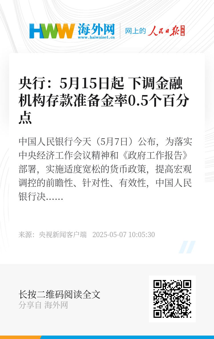 中国人民银行今天(5月7日)公布,为落实中央经济工作会议精神和《政府工作报告》部署,实施适度宽松的货币政策,提高宏观调控的前瞻性、针对性、有效性,中国人民银行决定,自2025年5月15日起,下调金融机构存款准备金率0.5个百分点(不含已执行5%存款准备金率的金融机构),下调汽车金融公司和金融租赁公司存款准备金率5个百分点。