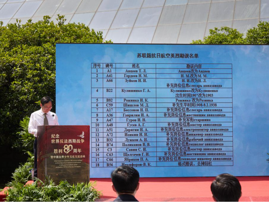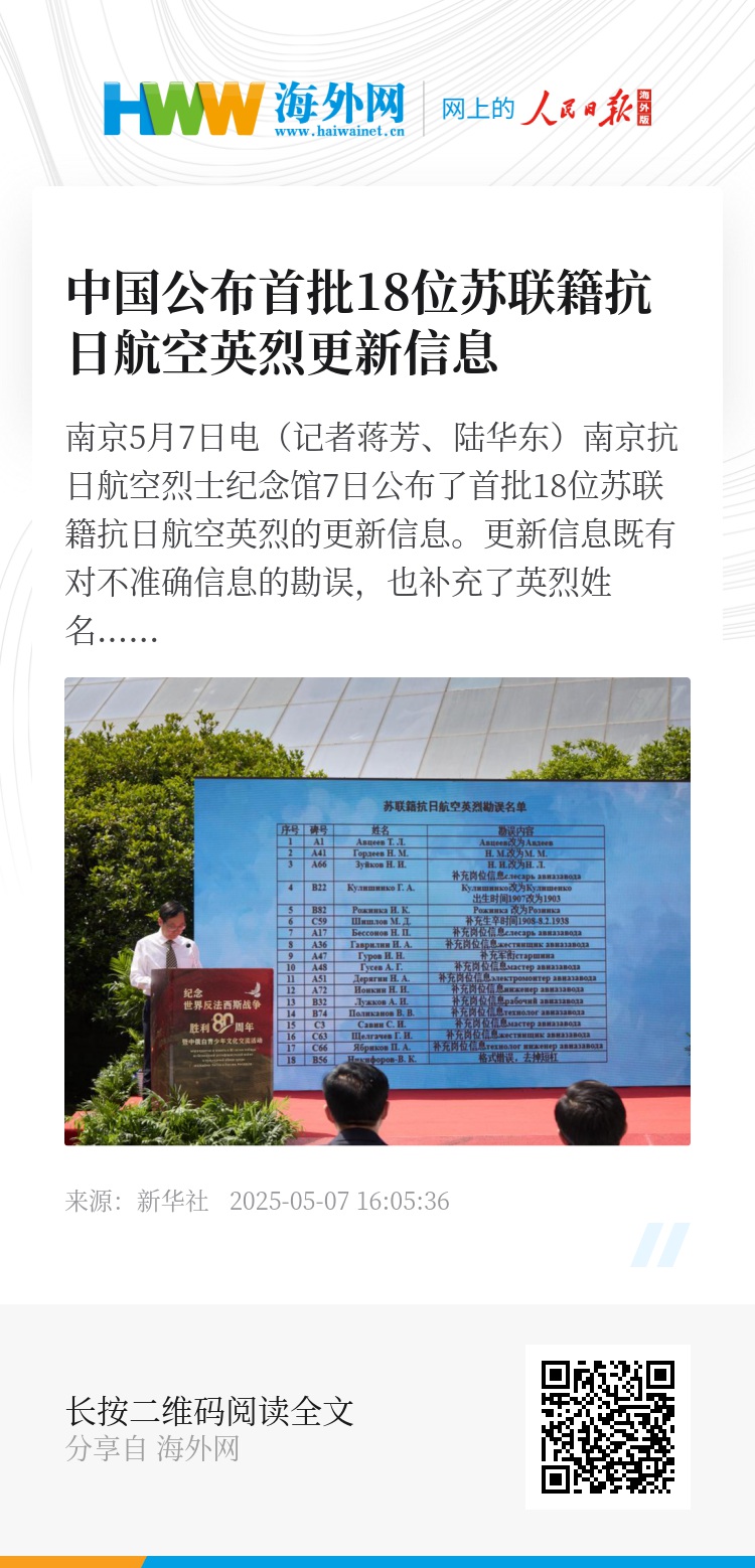 今年是中国人民抗日战争暨世界反法西斯战争胜利80周年。舆论认为,苏联籍抗日航空英烈信息更新,是缅怀英烈、铭记历史。