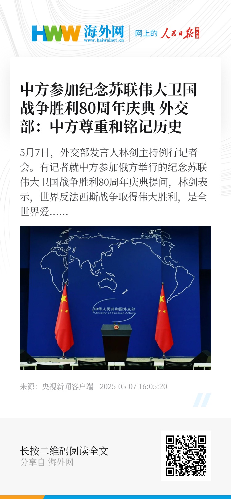 有记者就中方参加俄方举行的纪念苏联伟大卫国战争胜利80周年庆典提问,林剑表示,世界反法西斯战争取得伟大胜利,是全世界爱好和平、支持正义的国家和人民共同奋斗的结果。中国人民和苏联各族人民为此付出了巨大的民族牺牲,作出了不可磨灭的历史贡献。