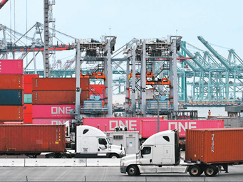 美国最大、最繁忙集装箱港口洛杉矶港负责人日前表示,随着美国关税政策导致企业削减进口订单,洛杉矶港入境货运量出现明显下跌。图为近日在洛杉矶港拍摄的货运卡车。