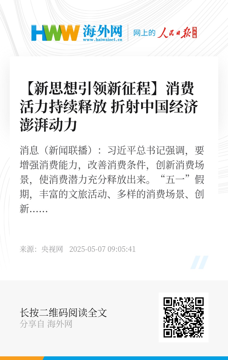 央视网消息(新闻联播):习近平总书记强调,要增强消费能力,改善消费条件,创新消费场景,使消费潜力充分释放出来。“五一”假期,丰富的文旅活动、多样的消费场景、创新的消费业态,全球最具发展潜力的消费市场持续涌动着新活力。