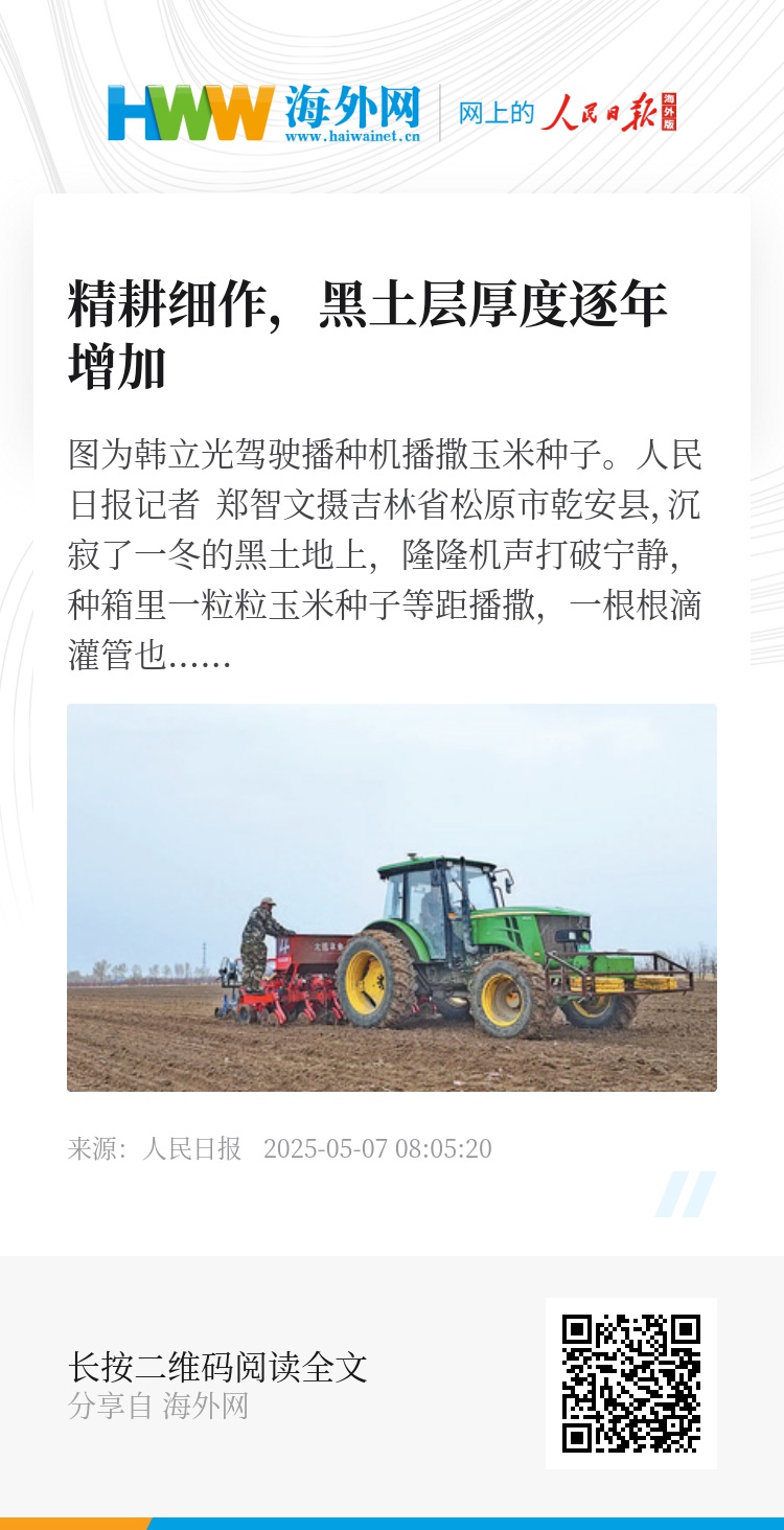 老韩驾驶的播种机,也有新变化。“前两年用上了北斗导航,今年又给种箱加了电控装置,播种更精准了。这地,越种越有劲!”哼着小曲儿,韩立光驶向下一块田。(记者 郑智文)