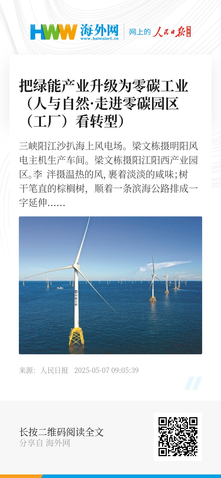 依托绿能示范产业园,阳江以海上风电为基础、多种绿色能源产业及相关制造业构筑的零碳工业生产体系正在酝酿升级。“阳江人自古‘靠海吃海’。我们从无到有、从小到大实现了海上风电的跨越式发展。如今,以海上风电赋能工业,打造零碳制造业,是应时代发展需要,从绿能产业升级为零碳工业的绿色转型发展。”阳江市政府有关负责人表示。