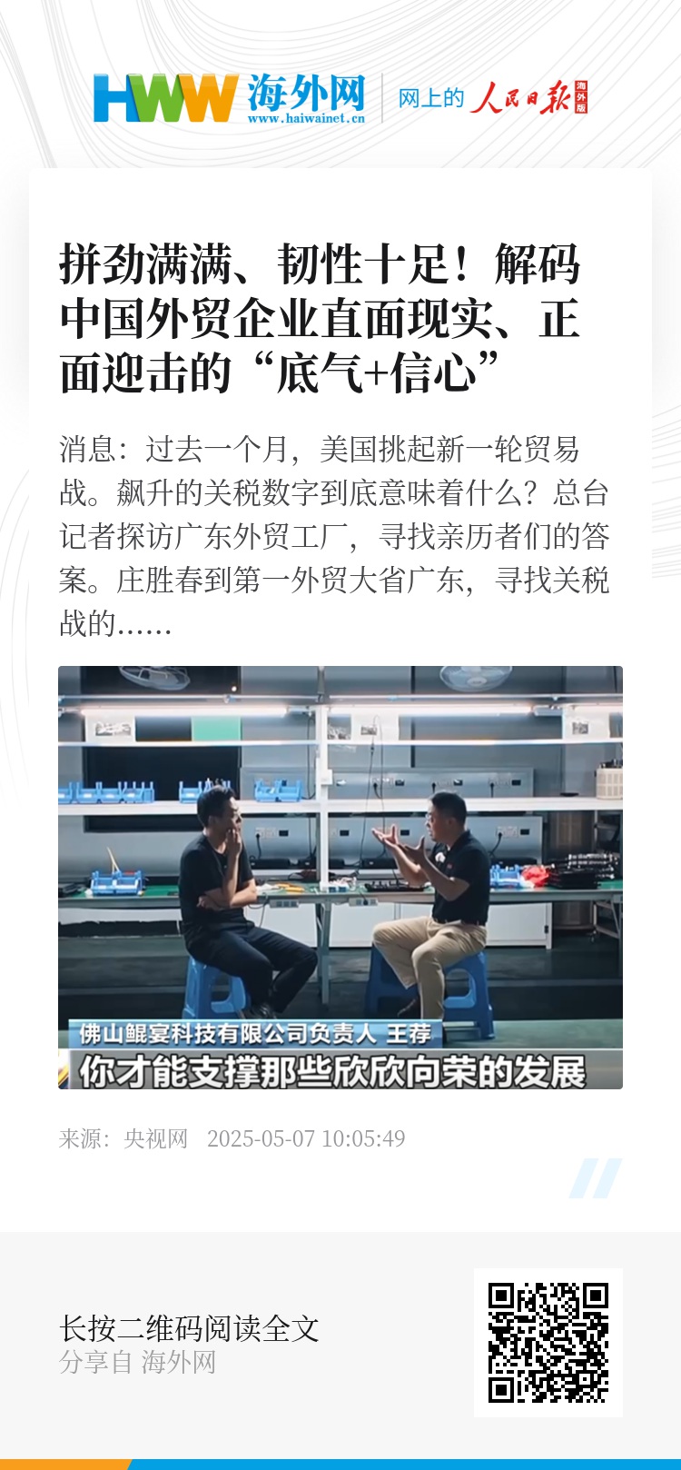 巴西客户的到来不仅给佛山鲲宴科技有限公司负责人王荐带来强烈的信心,更让王荐没想到的是,他刚刚向总台记者展示播放的那条短视频在网上火了。