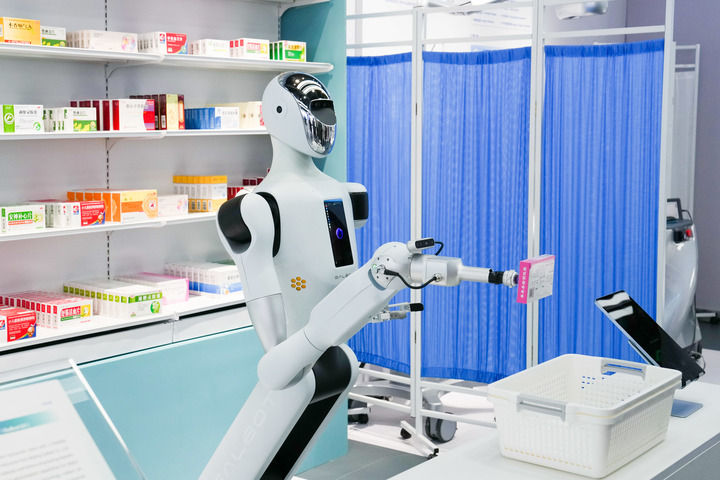 2025年2月24日,在北京“机器人大世界”的应用场景示范区,银河通用机器人进行药店无人值守场景演示。新华社记者 鞠焕宗 摄
