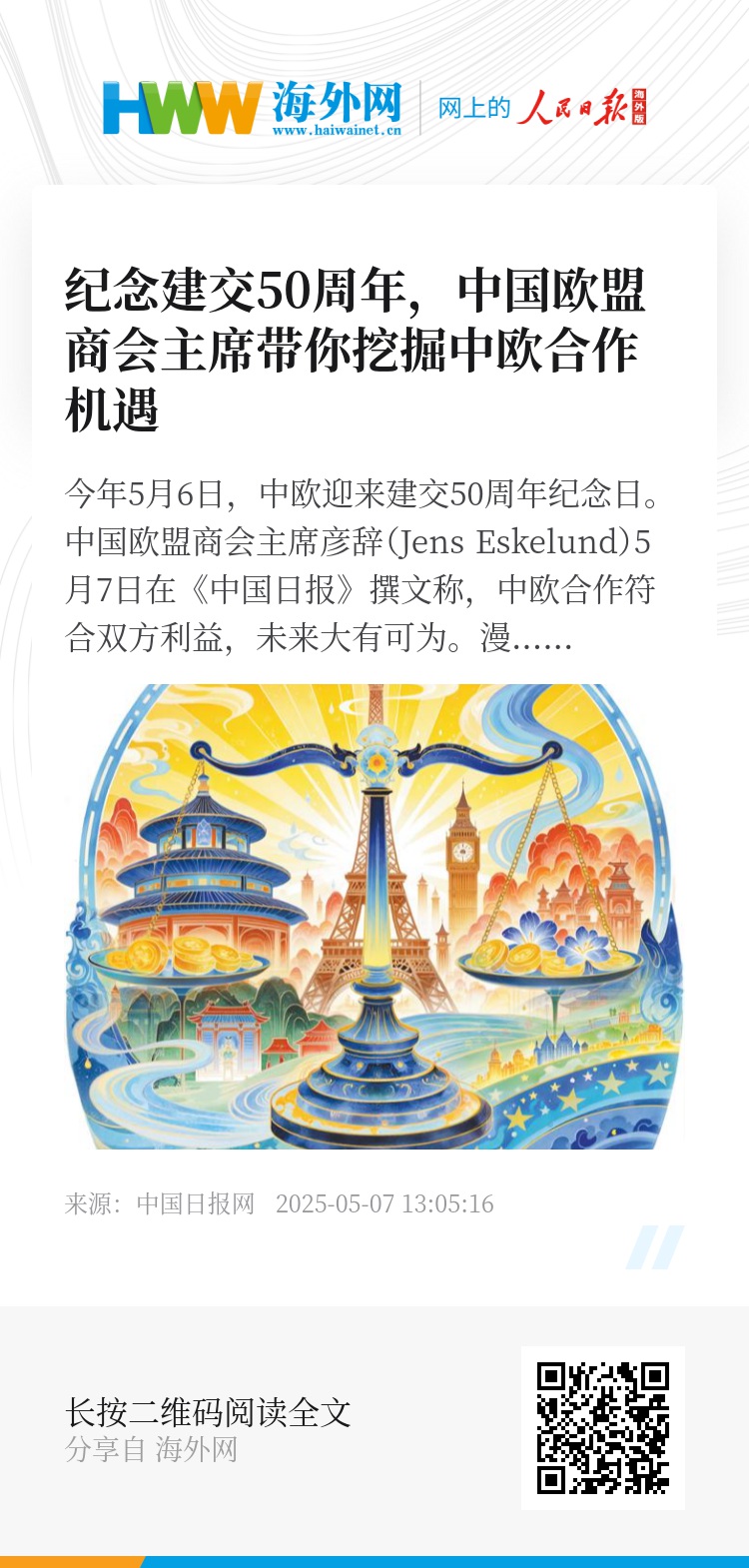 今年5月6日,中欧迎来建交50周年纪念日。中国欧盟商会主席彦辞(Jens Eskelund)5月7日在《中国日报》撰文称,中欧合作符合双方利益,未来大有可为。
