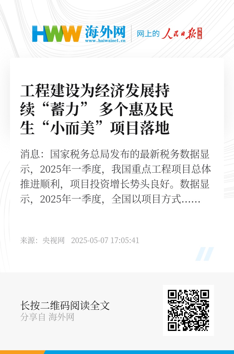央视网消息:国家税务总局发布的最新税务数据显示,2025年一季度,我国重点工程项目总体推进顺利,项目投资增长势头良好。