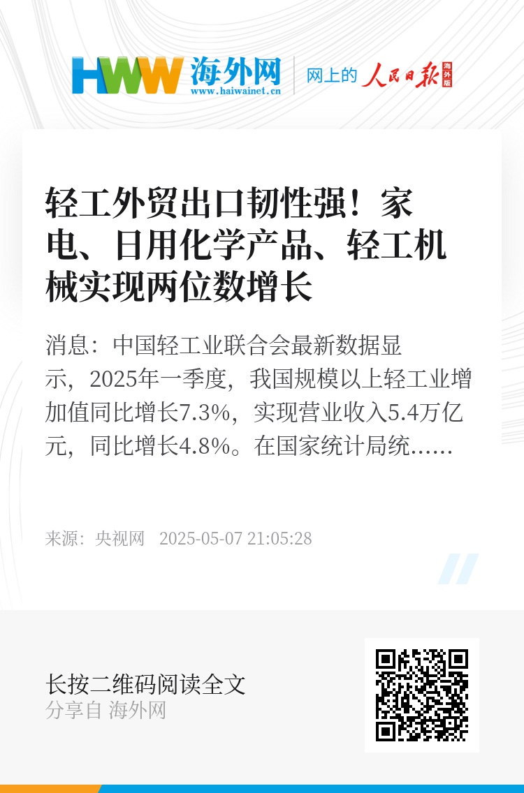 央视网消息:中国轻工业联合会最新数据显示,2025年一季度,我国规模以上轻工业增加值同比增长7.3%,实现营业收入5.4万亿元,同比增长4.8%。