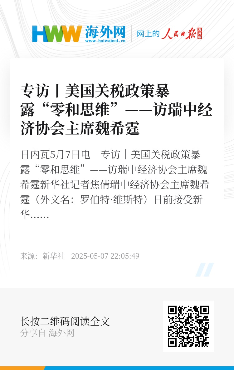新华社日内瓦5月7日电 专访|美国关税政策暴露“零和思维”——访瑞中经济协会主席魏希霆
