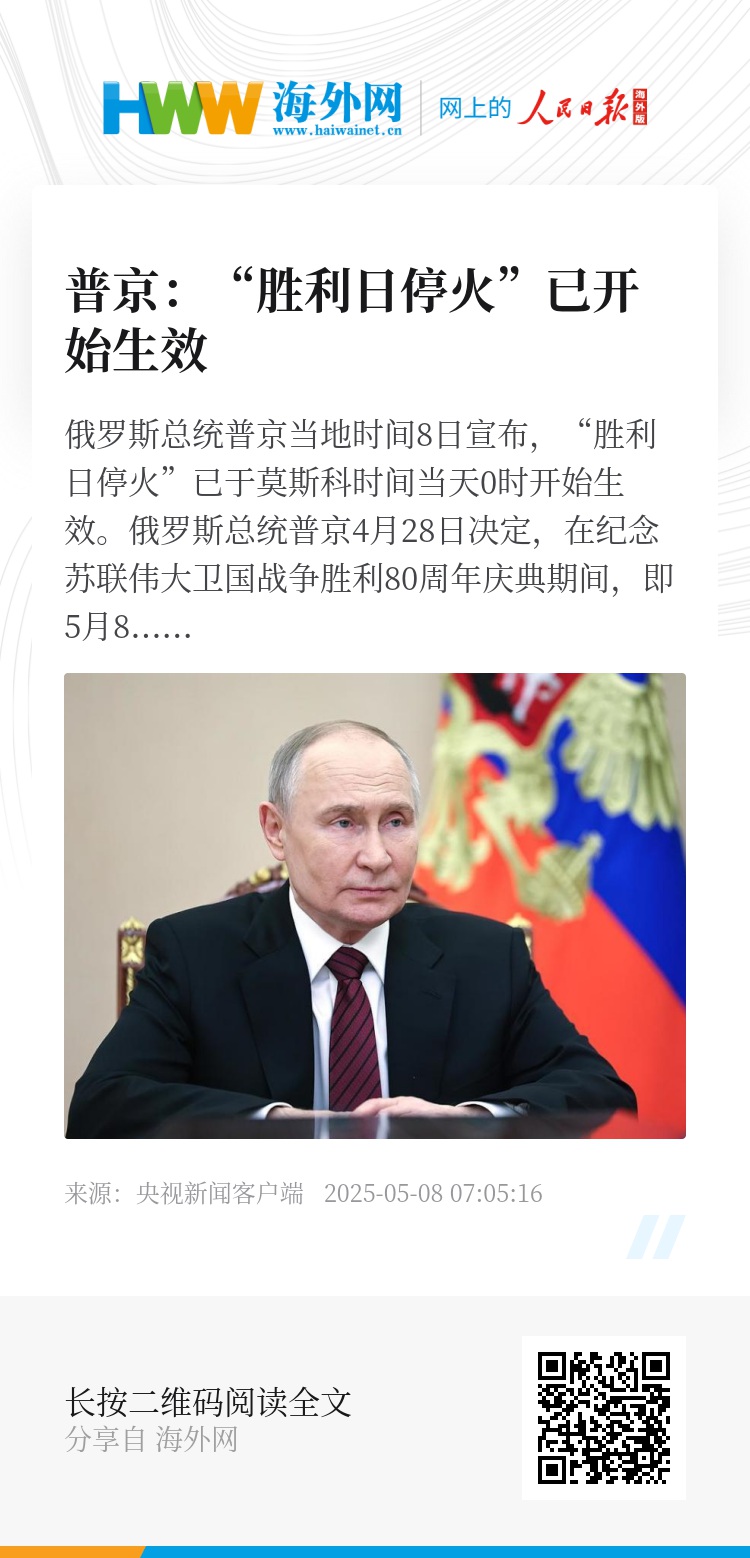 俄罗斯总统普京当地时间8日宣布,“胜利日停火”已于莫斯科时间当天0时开始生效。