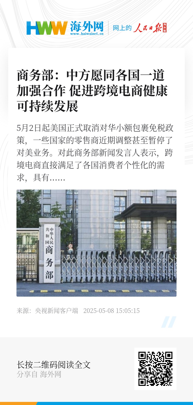 对此商务部新闻发言人表示,跨境电商直接满足了各国消费者个性化的需求,具有效率高、到货快、费用省等独特的优势,近期美方取消对华小额免税政策,这将损害两国企业和消费者的利益,对此我们坚决反对。我想强调的是,美方取消对华小额免税政策,改变不了跨境电商快速发展的势头,我们愿意同各国一道加强合作,共同营造公平可预期的政策环境,促进跨境电商健康可持续发展。