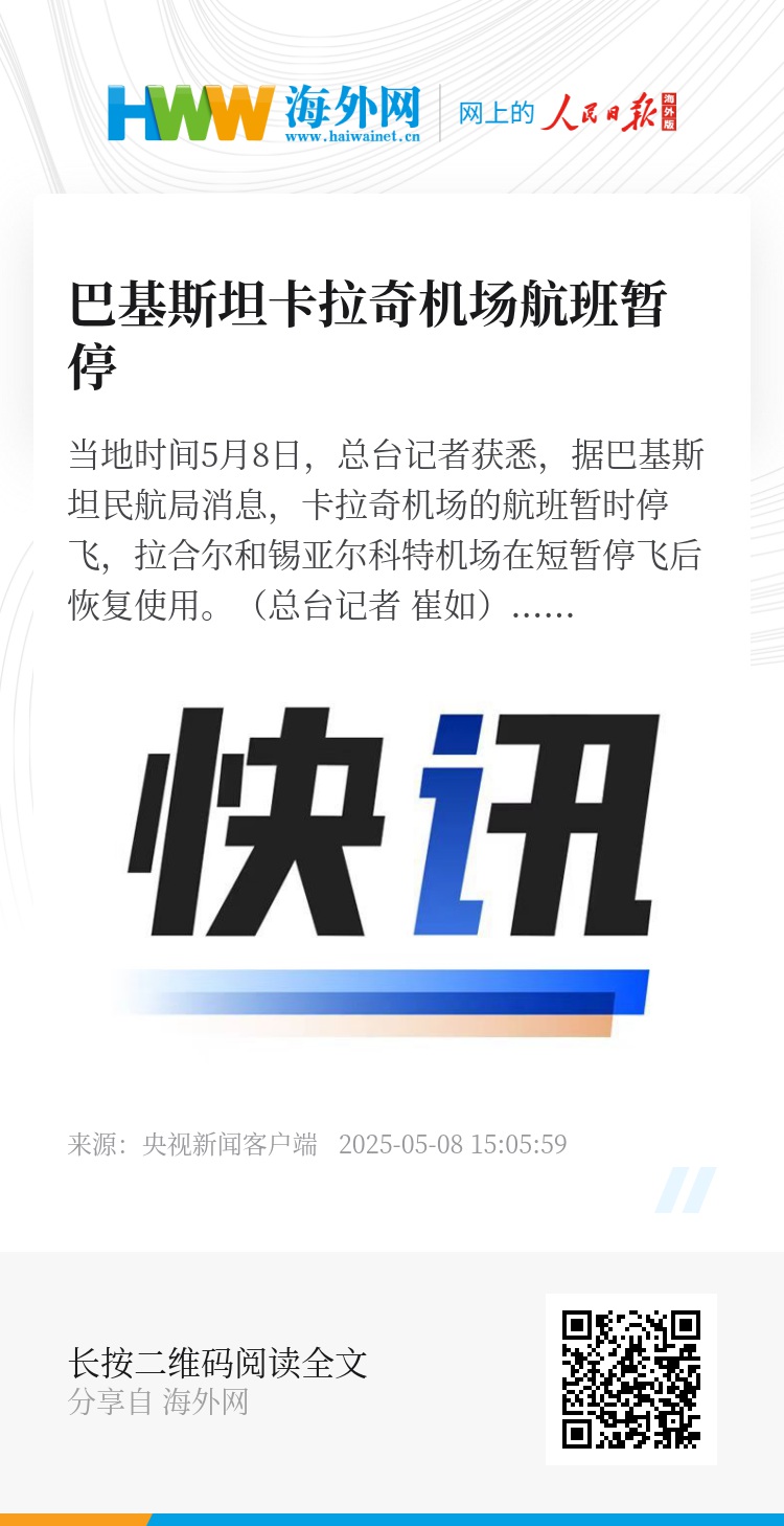 当地时间5月8日,总台记者获悉,据巴基斯坦民航局消息,卡拉奇机场的航班暂时停飞,拉合尔和锡亚尔科特机场在短暂停飞后恢复使用。(总台记者 崔如)