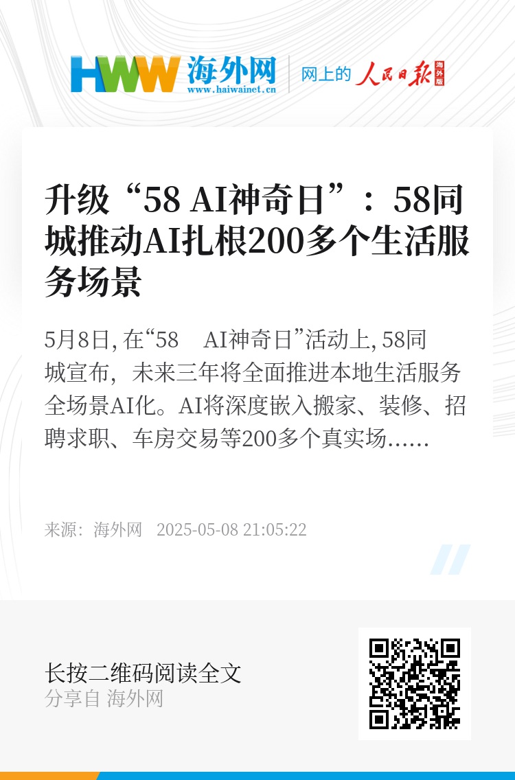 5月8日,在“58 AI神奇日”活动上,58同城宣布,未来三年将全面推进本地生活服务全场景AI化。AI将深度嵌入搬家、装修、招聘求职、车房交易等200多个真实场景,成为中小企业的“数字分身”和劳动者的“最佳助手”。