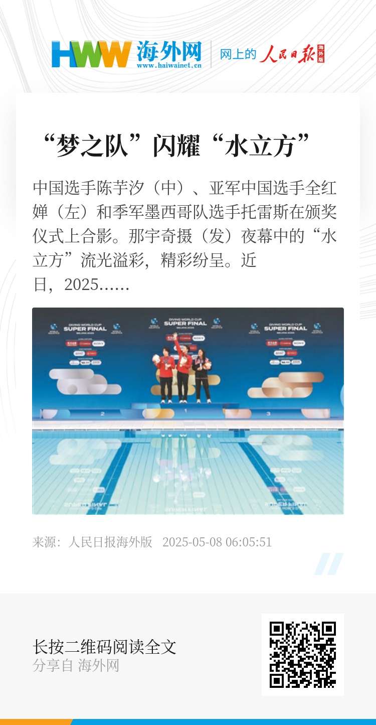 夜幕中的“水立方”流光溢彩,精彩纷呈。近日,2025年世界泳联跳水世界杯总决赛在国家游泳中心“水立方”举行,由陈芋汐、全红婵、陈艺文、昌雅妮、王宗源5位巴黎奥运会冠军领衔的中国跳水“梦之队”凭借精彩发挥,最终包揽本次赛事的全部9枚金牌。