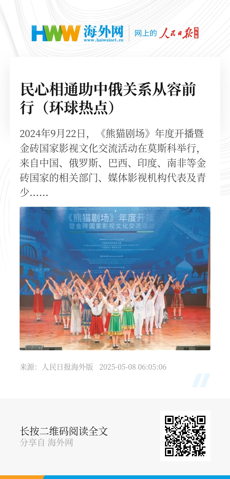 这是中俄人文交流的又一生动例子。自去年5月“中俄文化年”开幕以来,双方举办了一系列接地气、连民心、有热度的人文交流活动,进一步释放两国文化合作潜力,为中俄友好的世代传承、两国人民的相知相亲注入新动力。