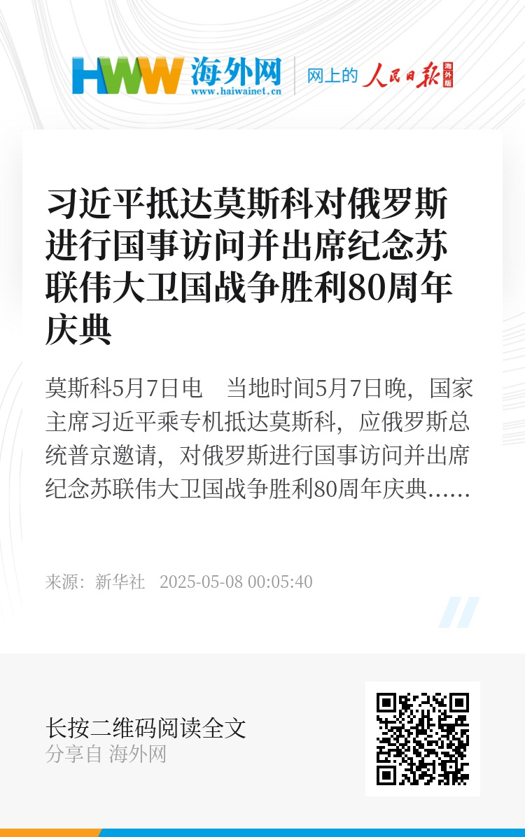 新华社莫斯科5月7日电 当地时间5月7日晚,国家主席习近平乘专机抵达莫斯科,应俄罗斯总统普京邀请,对俄罗斯进行国事访问并出席纪念苏联伟大卫国战争胜利80周年庆典。