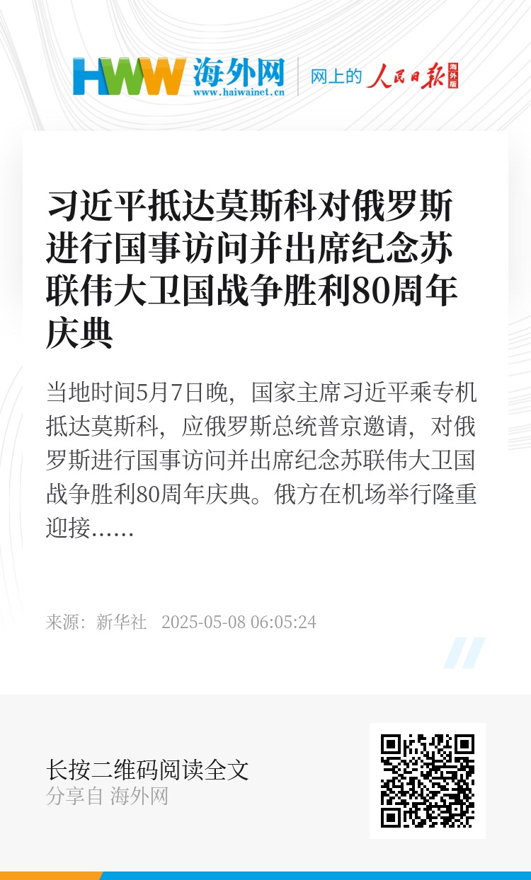 新华社莫斯科5月7日电(记者杨依军 江宥林)当地时间5月7日晚,国家主席习近平乘专机抵达莫斯科,应俄罗斯总统普京邀请,对俄罗斯进行国事访问并出席纪念苏联伟大卫国战争胜利80周年庆典。