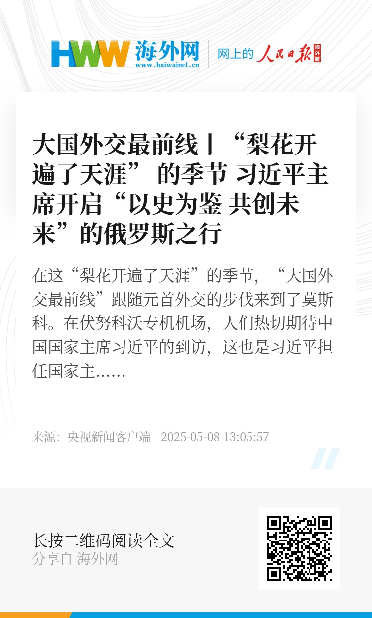 在这“梨花开遍了天涯”的季节,“大国外交最前线”跟随元首外交的步伐来到了莫斯科。在伏努科沃专机机场,人们热切期待中国国家主席习近平的到访,这也是习近平担任国家主席以来第11次俄罗斯之行。“以史为鉴 共创未来”,新行程已经开启,“大国外交最前线”继续实时跟进!