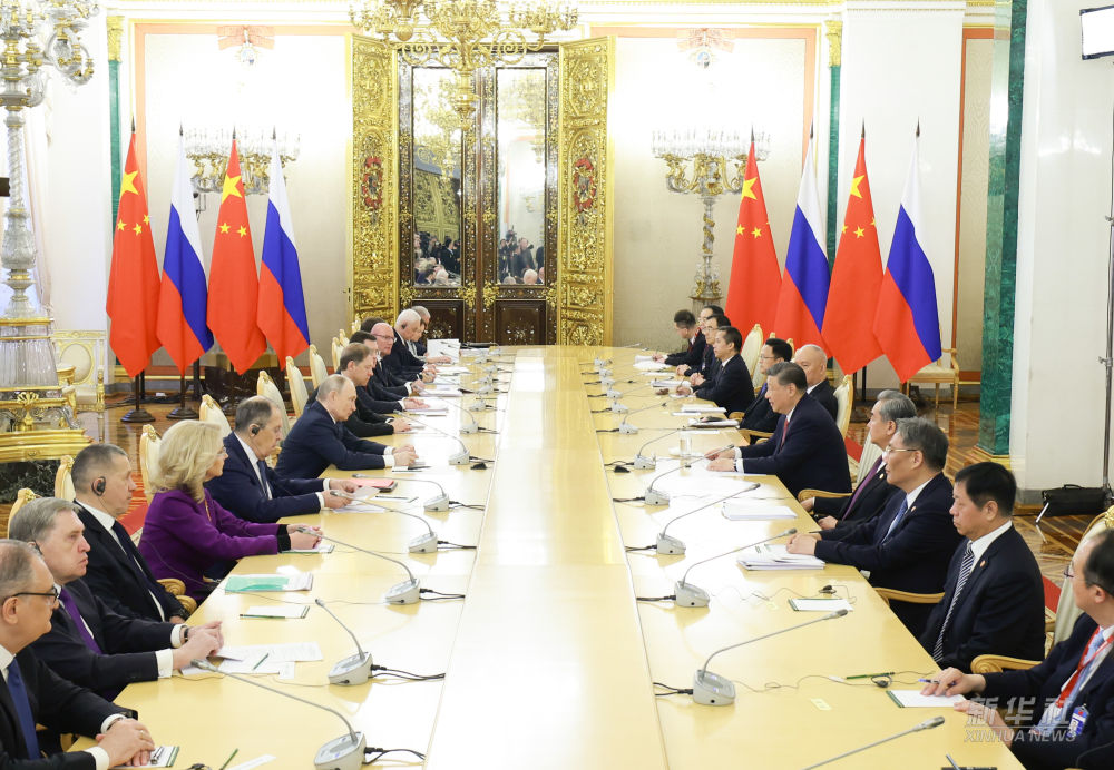 当地时间5月8日上午,俄罗斯总统普京同中国国家主席习近平在莫斯科克里姆林宫举行会谈。