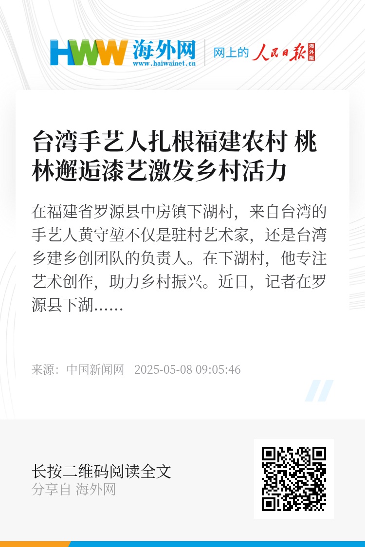 在福建省罗源县中房镇下湖村,来自台湾的手艺人黄守堃不仅是驻村艺术家,还是台湾乡建乡创团队的负责人。在下湖村,他专注艺术创作,助力乡村振兴。近日,记者在罗源县下湖村约访了黄守堃。