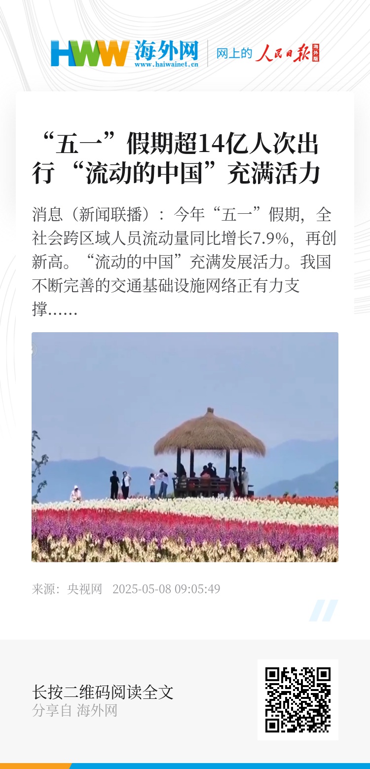 这个“五一”假期,从雪域高原到椰林海岸,从繁华都市到偏远乡村,车流穿梭、人潮涌动。全社会跨区域人员流动量超14.65亿人次,日均超2.9亿人次,比去年“五一”增长7.9%,再创历史同期新高。