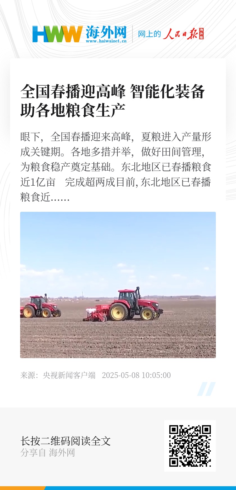 目前,东北地区已春播粮食近1亿亩,完成超两成。黑龙江今年大力推广高性能精密播种机等智能化农机装备,新增高性能播种机作业面积近1000万亩。吉林今年农作物耕种收综合机械化率达到94.7%。