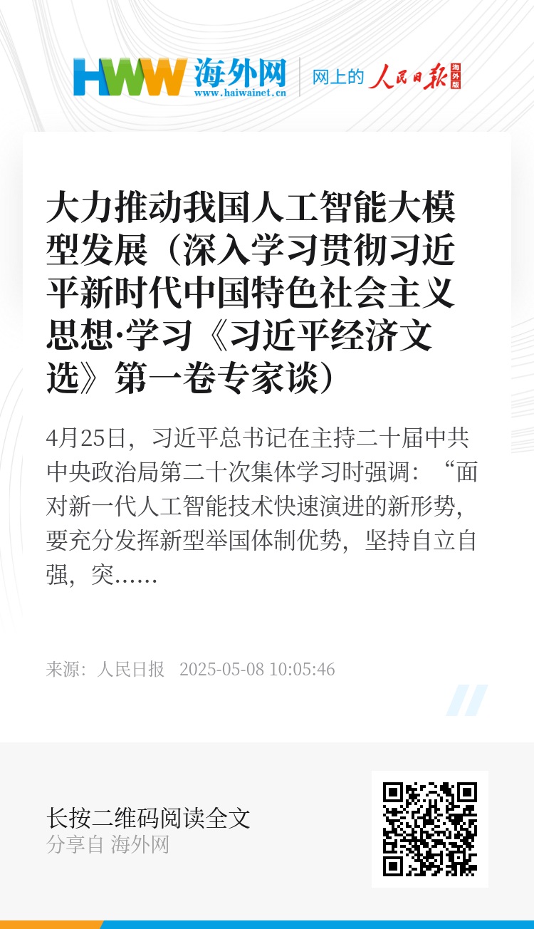 人工智能大模型是通过深度学习技术在海量数据上训练出来的、拥有大规模参数和复杂计算结构的机器学习模型,能够理解和生成多模态内容,具有逻辑推理和问题求解能力,是推动新一代人工智能发展的关键技术载体和新型基础设施。我们要以习近平经济思想为指引,充分认识人工智能大模型的战略属性,加快人工智能大模型研发应用创新,为我国实现高水平科技自立自强、推动高质量发展、在全球人工智能发展与治理中发挥积极作用提供有力支撑。